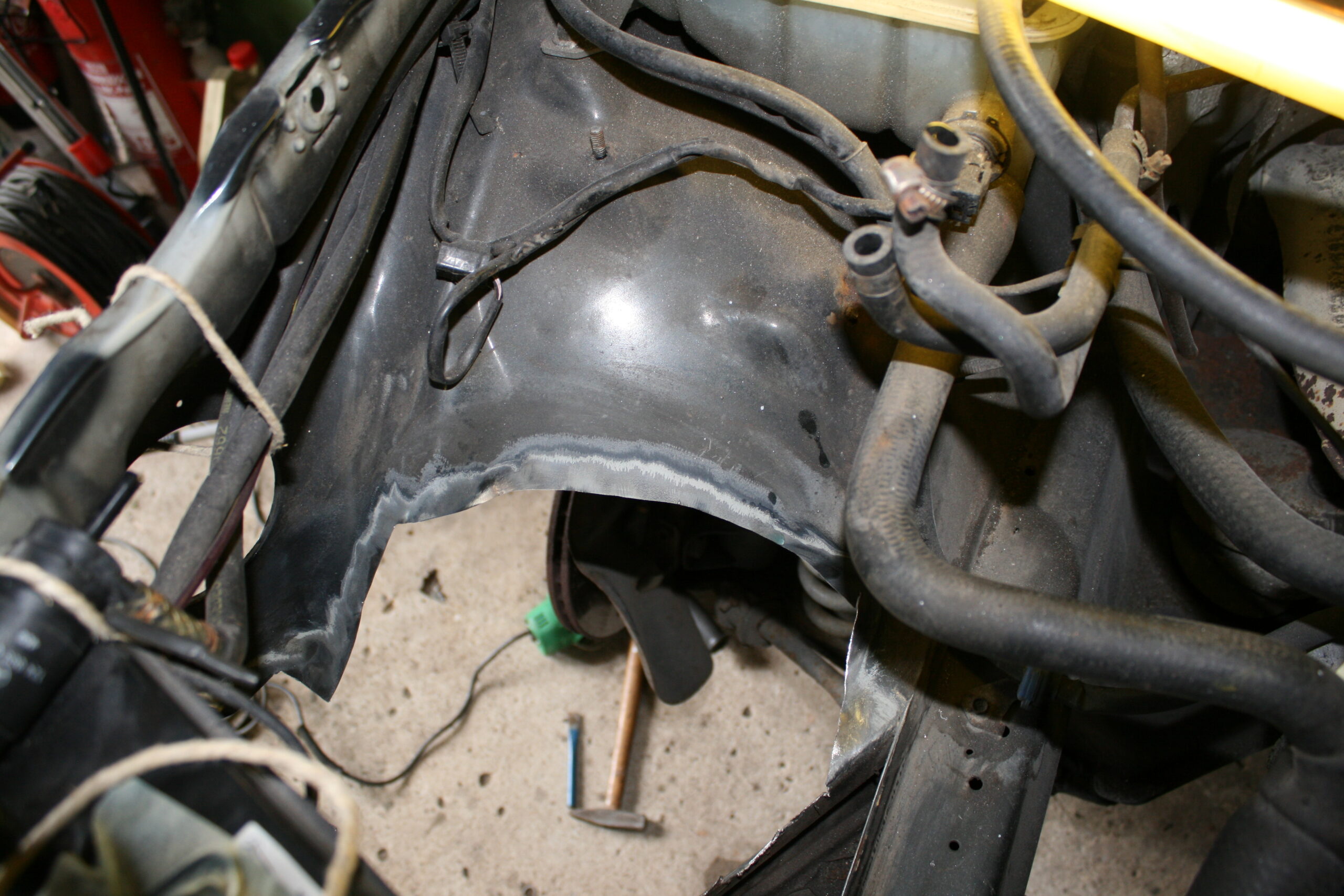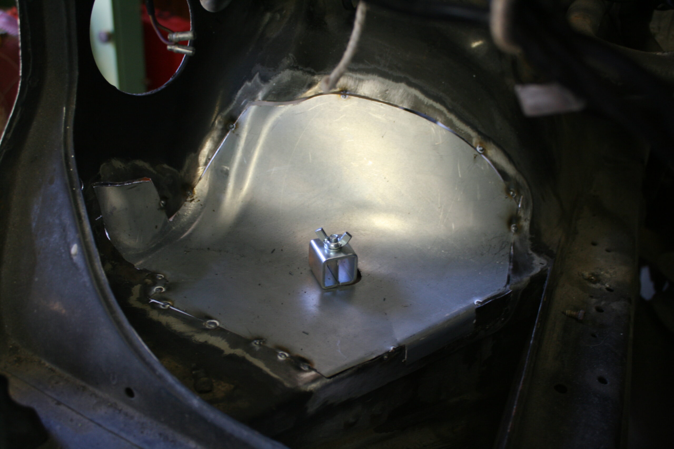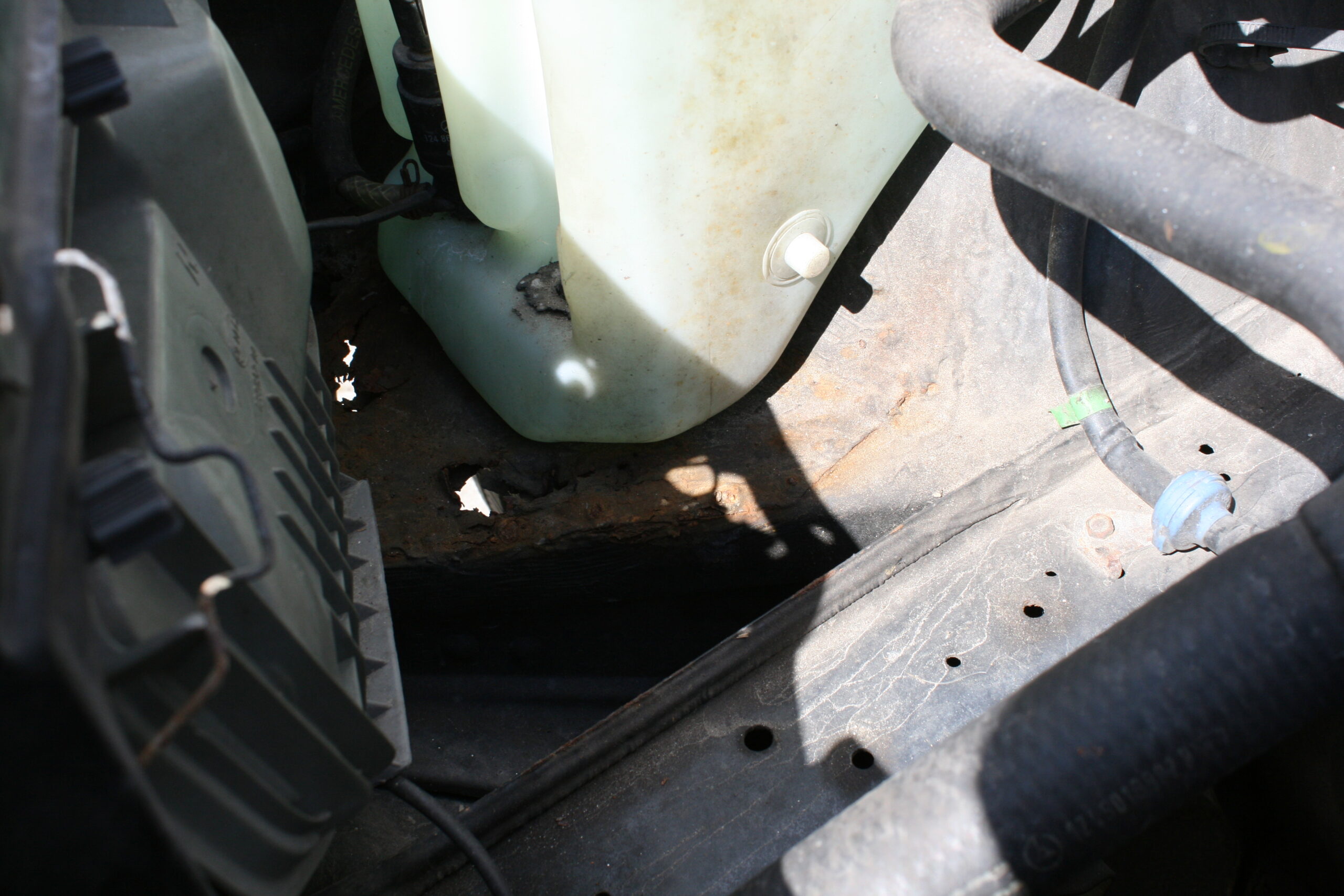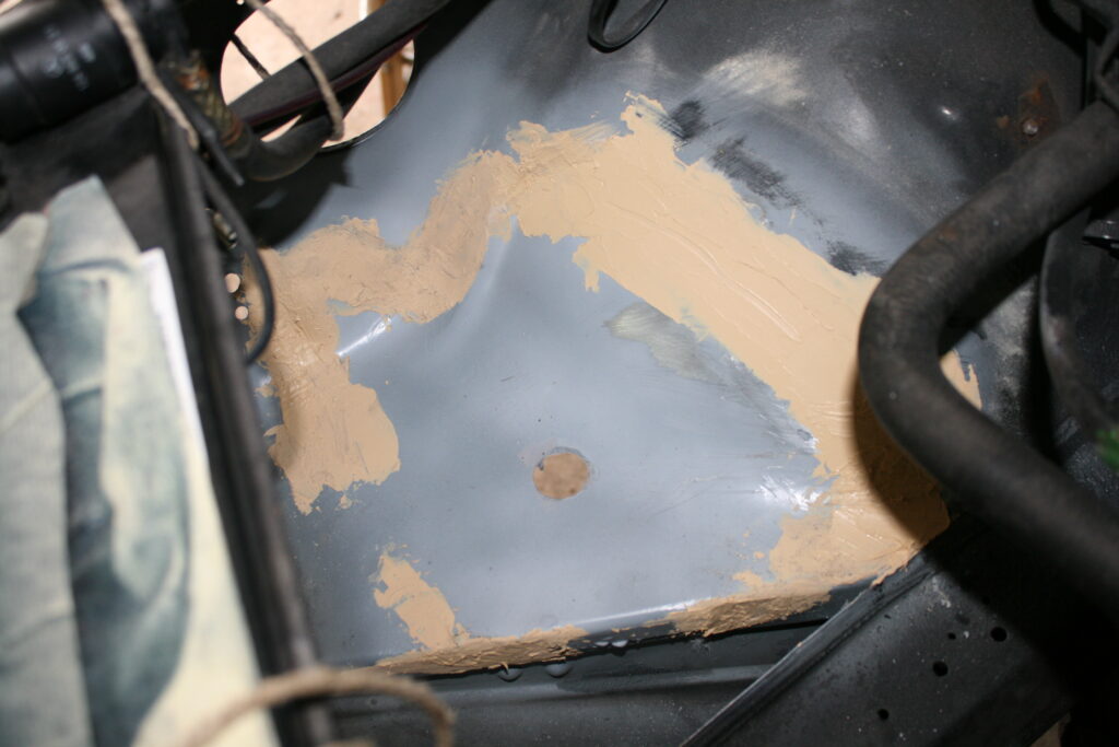 dachte mir, dass das Blech unter dem Wischwasserbehälter ein super Startprojekt wäre. Zum einen konnte ich das von oben schweißen, ohne, dass mir andauernd Schweißperlen ins Gesicht fallen würden, zum anderen könnte ich mich so am Dengeln von Reparaturblechen üben. Dachte ich. Ein bisschen anders kam es dann doch. Doch bevor ich damit anfing, musste erst einmal der Wischwasserbehälter raus. Und wenn man von zwei Muttern, die den Behälter an zwei Stehbolzen festhalten (wovon mir einer natürlich abriss) absieht, ist nur noch der Wasserstandssensor und die die Scheibenwaschpumpe am Behälter fest. Und als ich den Stecker von der Scheibenwaschpumpe abziehen wollte, zog ich die Pumpe raus und überall sprudelte das Scheibenklar hin. So bindet man wohl Staub ab…
