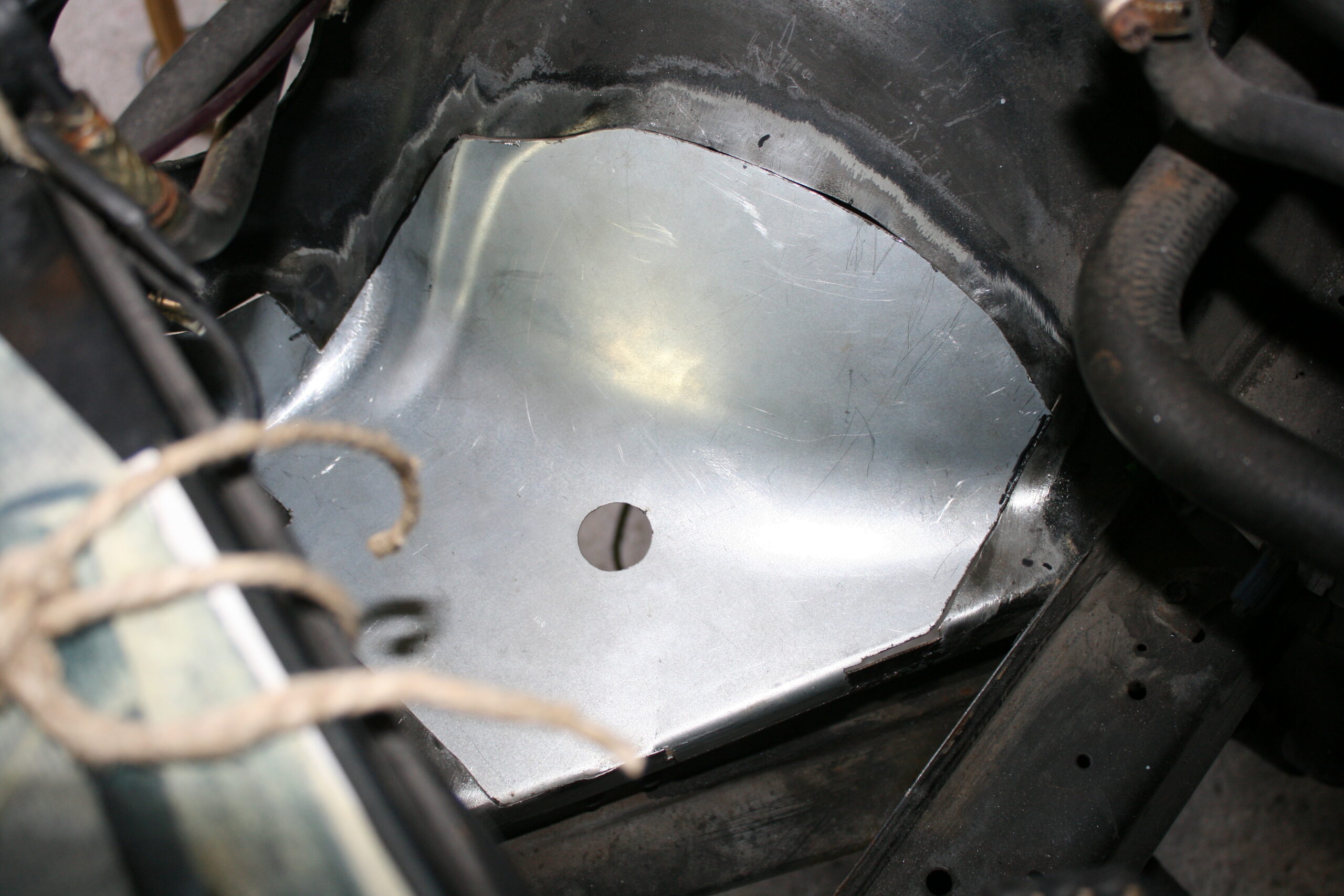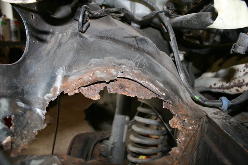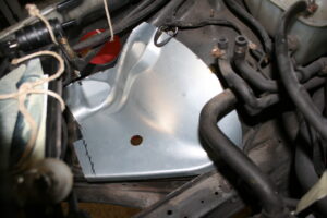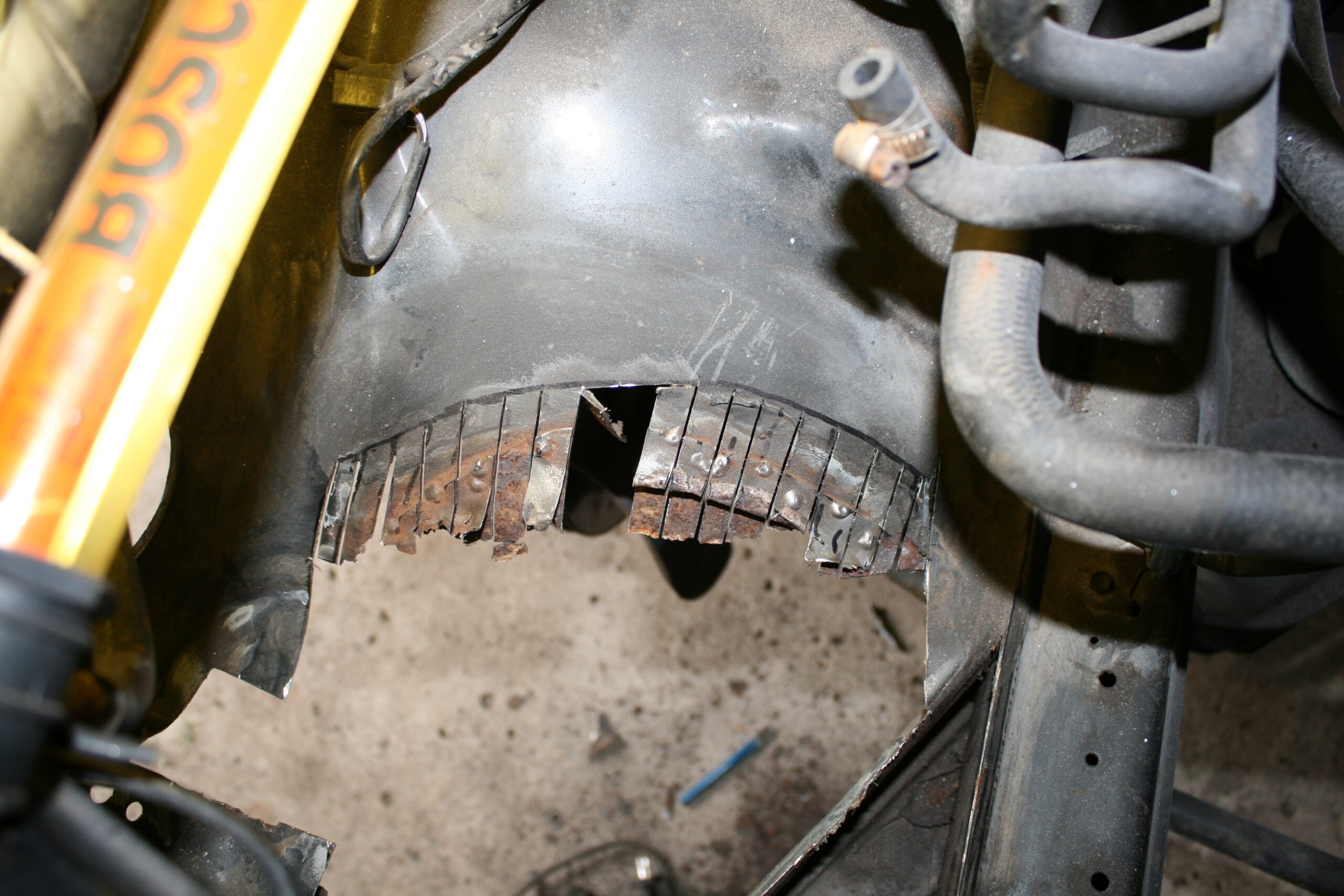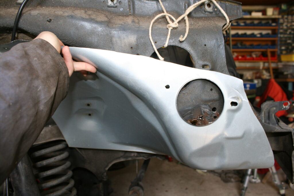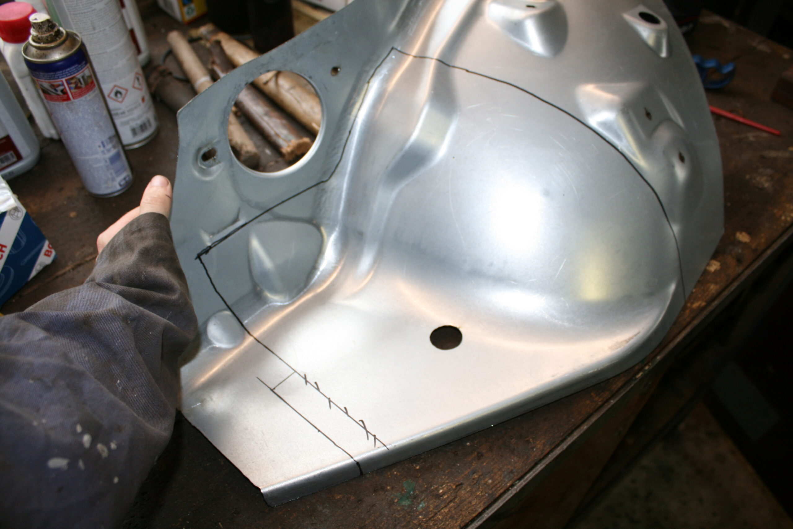 mir die alte Reparatur unter dem Wischwasserbehälter ansah, desto unsicherer war ich mir, ob ich das Blech wirklich selbst dengeln sollte. Da war nämlich nicht nur nur das glatte „Bodenstück“ weggefault, sondern auch die vielen Rundungen des Doms und der Stehbleche. Kurz dachte ich daran, das Blech zu stückeln – aber gleichzeitig empfand ich das auch als keine so gute Idee. Sollte ich wirklich einmal einen Unfall mit Hein haben (Was ich nicht hoffe!), wäre die Ecke so als Knautschzone nicht ganz so unwichtig. Und wenn dann da mehrere Schweißnähte in der Ecke wären, die ja etwas poröser sind als normales Blech, wäre Hein da nicht mehr so stabil. Außerdem kostete das Reparaturblech nur 53€. Ich sah, ich klickte, ich kaufte.